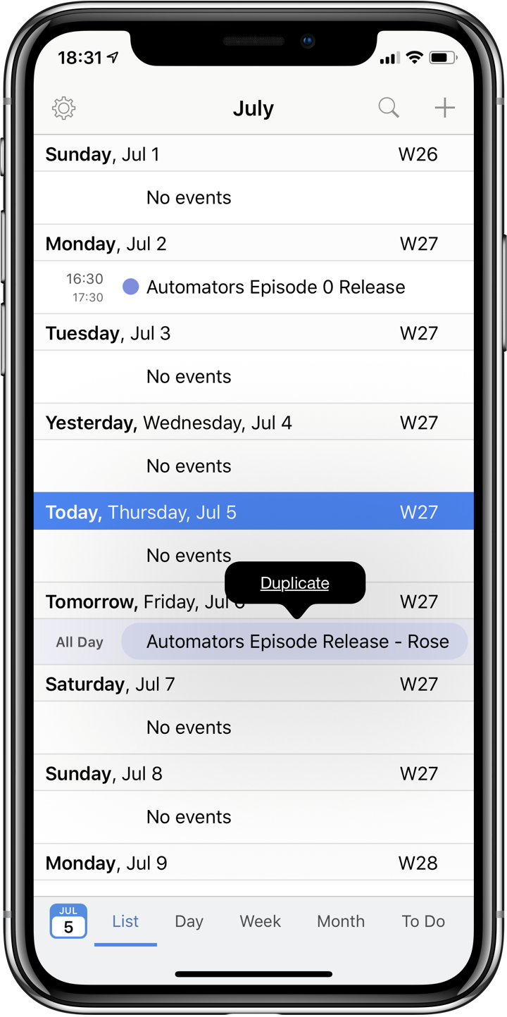 CMD+Cand thenCMD+Vlets you paste, if you select a new date before you paste then the event is automatically added to that day. In many apps you can even paste it in at the time you have selected. - Fantastical on iOS gives you the option to duplicate an event when you tap and hold on it, or when you swipe, and tap "More...", BusyCal allows you to duplicate an event by force touching it. I personally prefer Fantastical as it immediately asks me for the new date where as with BusyCal you need to edit the new event.