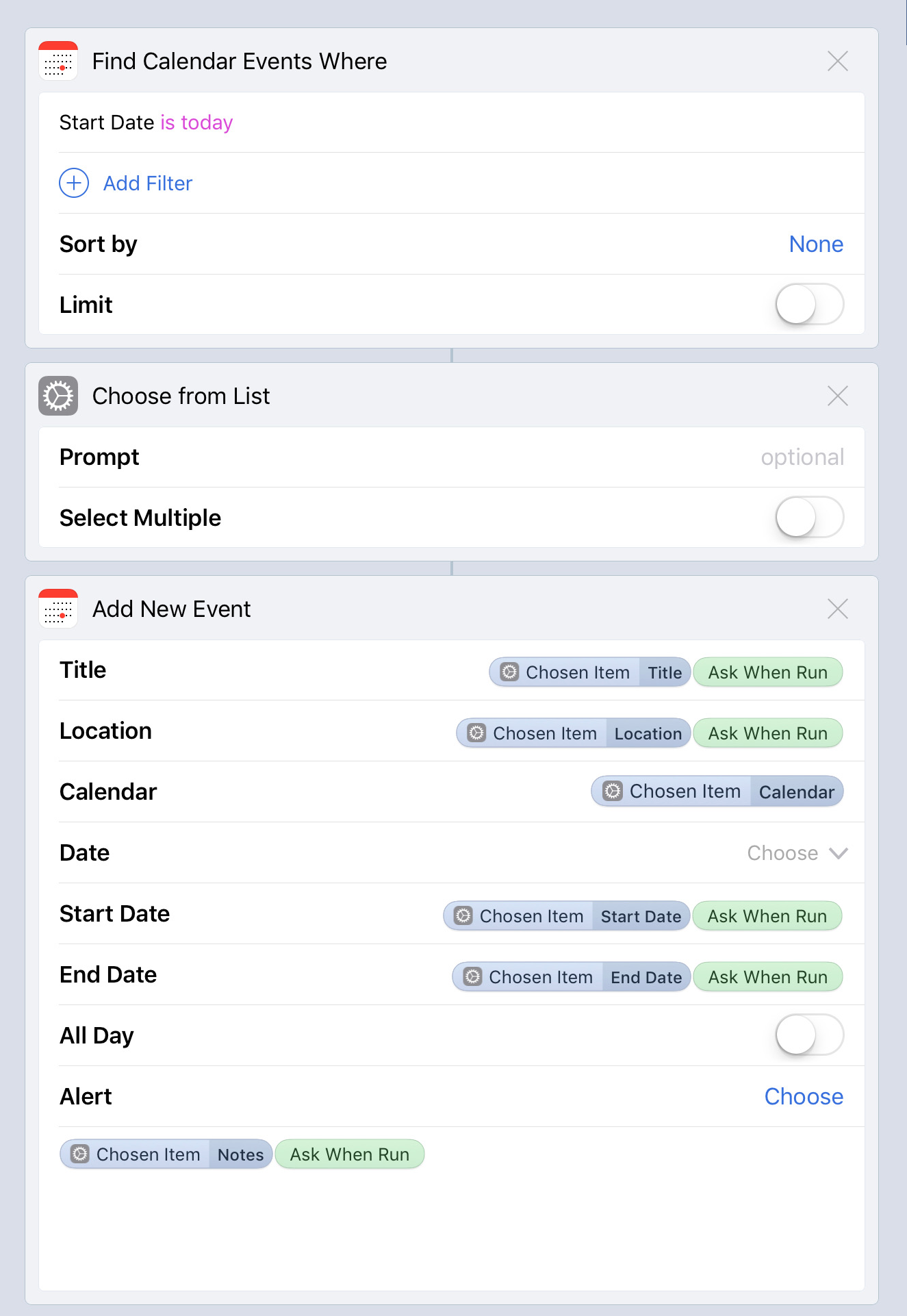 This is a very simple Workflow which asks me for the date and time of the event, and then what kind of event this is (the demo has 3 examples) - it then adjusts the time to add an appropriate length for the appointment and adds it to my calendar. This is very useful because I can never remember what floor my dentist is on or exactly where to turn to find my hairdresser - so I can add this to the notes. Even if the places you frequent are not hidden like mine are you can still use this!