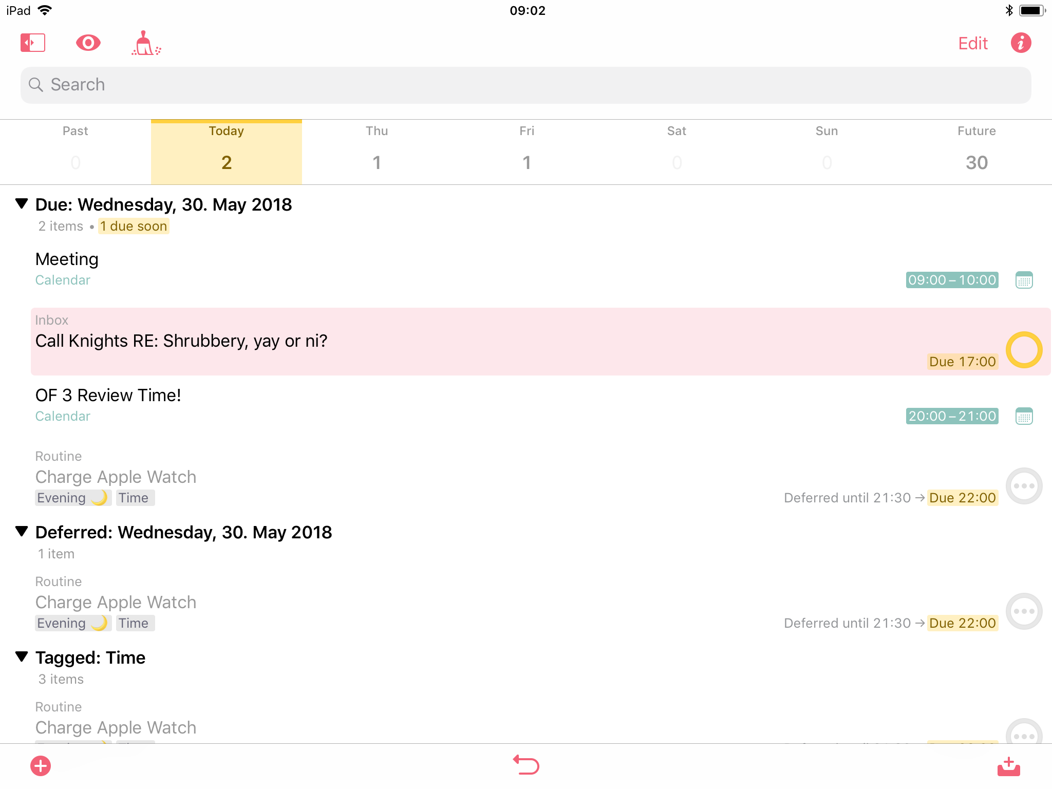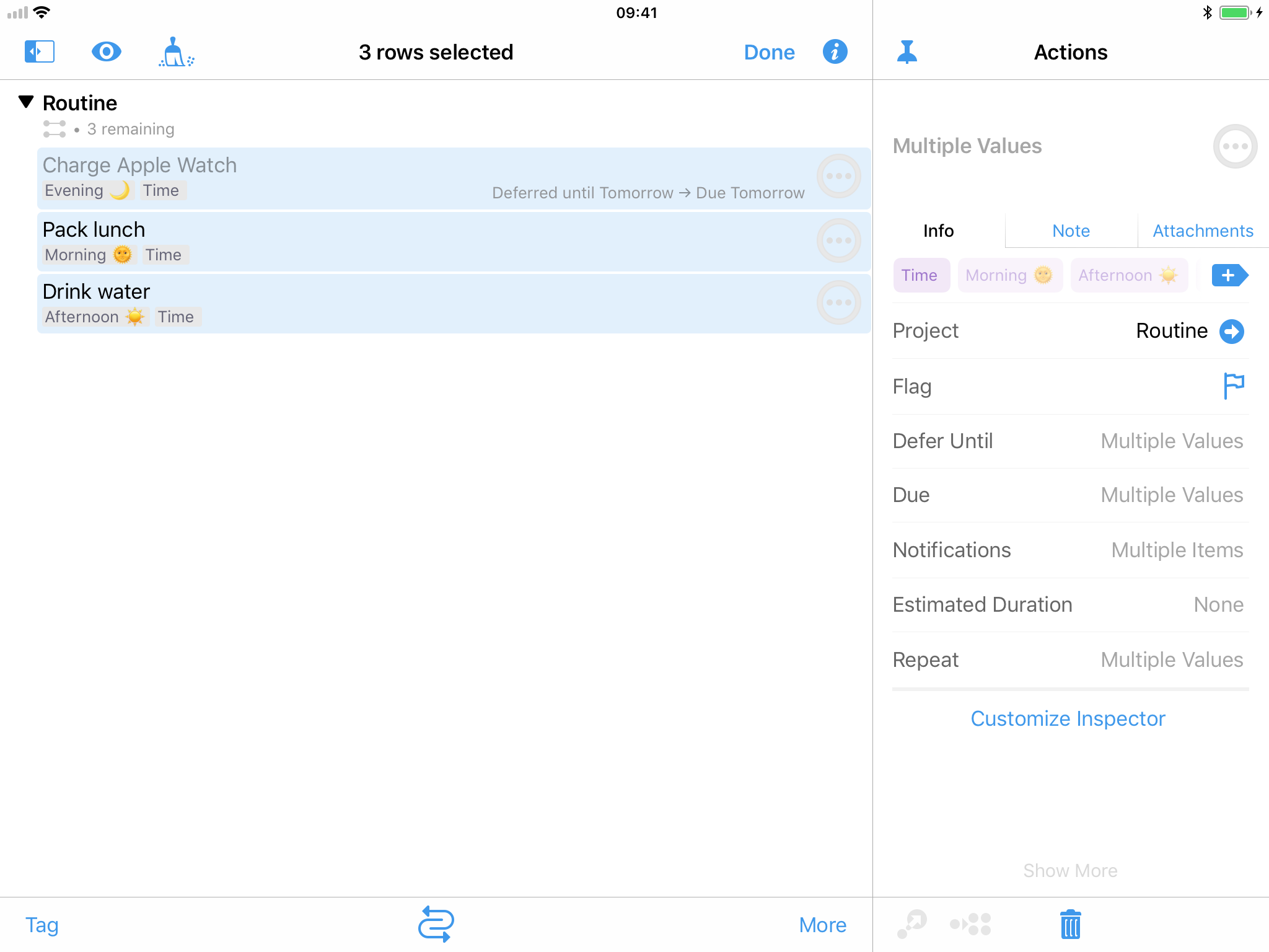 Being able to edit more than one task at once is not a feature I need frequently, but it is one I really appreciate when I use it. You can enable it by tapping the "Edit" button in the top right, and then selecting multiple tasks. You can access the task inspector in the batch edit mode, and it will show you all of the properties which are the same, and a greyed out option where they're different. If I selected two tasks, one had a due date of today and one with tomorrow, I could still set a new due date for both items at the same time though. You can also use CMD+A to select all the tasks in the current view if you have an external keyboard attached - very useful if your inbox was empty, you added a lot of tasks and then realised they should have been in a project instead!