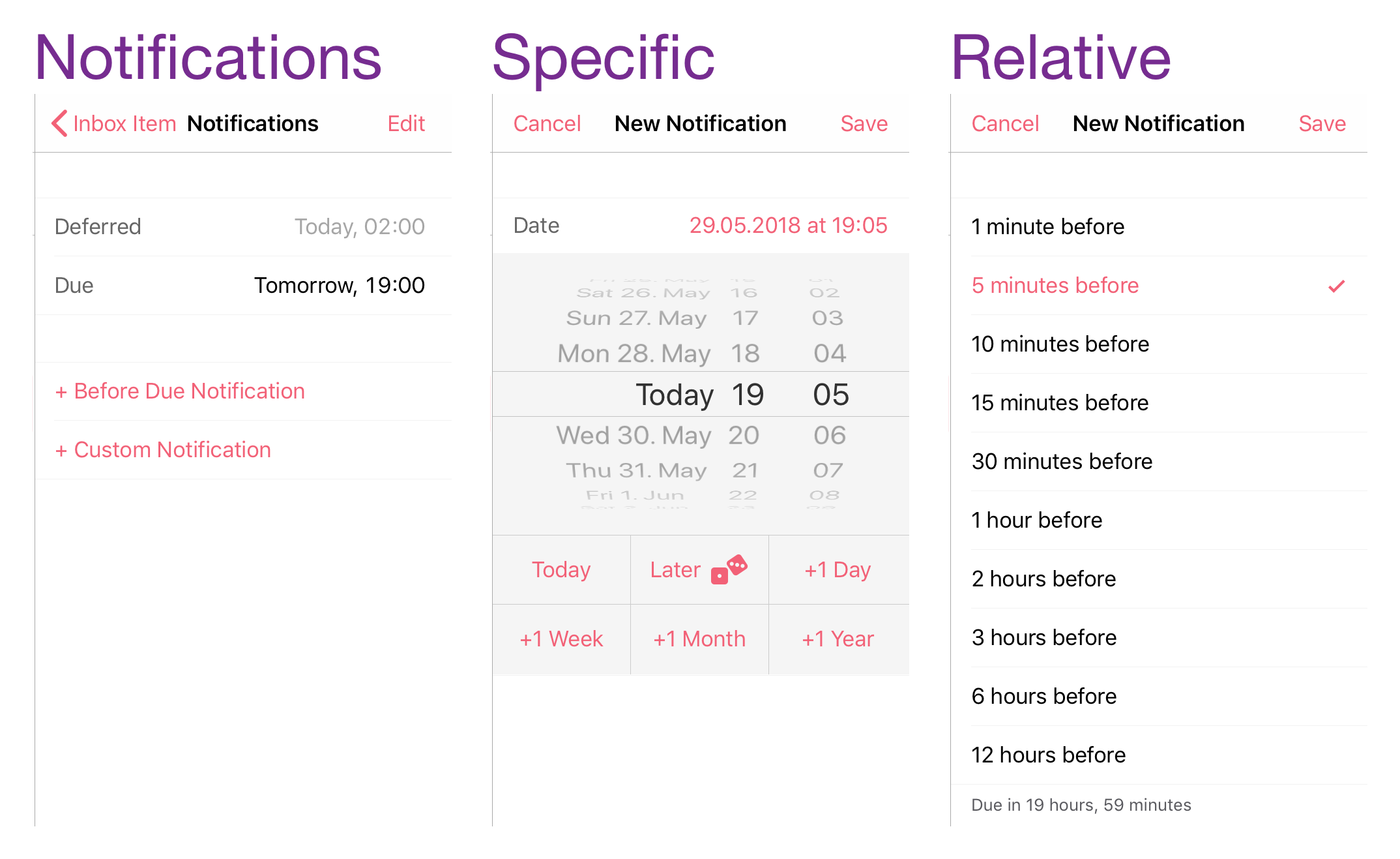 Some tasks are very important, so important you want flashing lights, sirens, and people in hazmat suits running around if the deadline gets too close. In the main settings you can specify notifications for due dates and defer dates globally, and these can also be enabled or removed on each task. You are also able to set two extra kinds of notifications - ones relative to the due date, and ones at a specific date and time. These reminders are a great help with those crucial tasks - if you need someone with a hazmat suit though you're on your own.