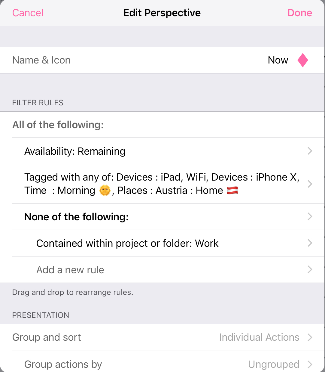 The best part of perspectives is being able to add as many rules as you like. The top level is always "All of the following", and then you start adding rules within that. You can also add "Any of the following", "None of the following" and "All of the following" and add rules inside of those - useful for requiring a group of rules (e.g. flagged and has Tag X), or setting optional groups. I have a "Now" perspective which changes all the time, and I tap the rule above my Work folder to change it to "All of the following" to "None of the following" depending on if I'm at work or not.