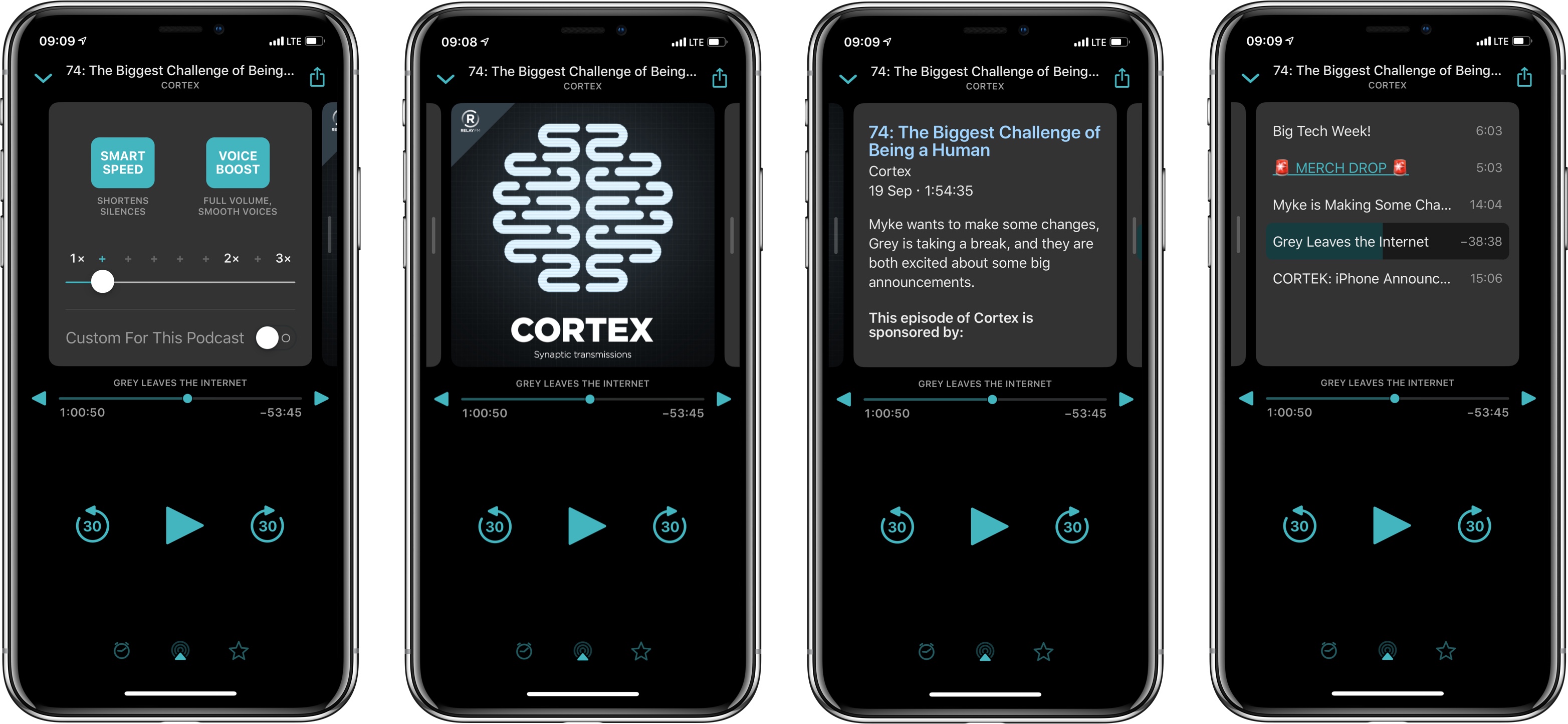 The Now Playing Screen in Overcast has been revamped to use a cards style, with show notes and chapters being split onto separate screens - this is going to be useful as then I will be able to see which chapter I'm currently listening to but still preserve my place in the show notes.